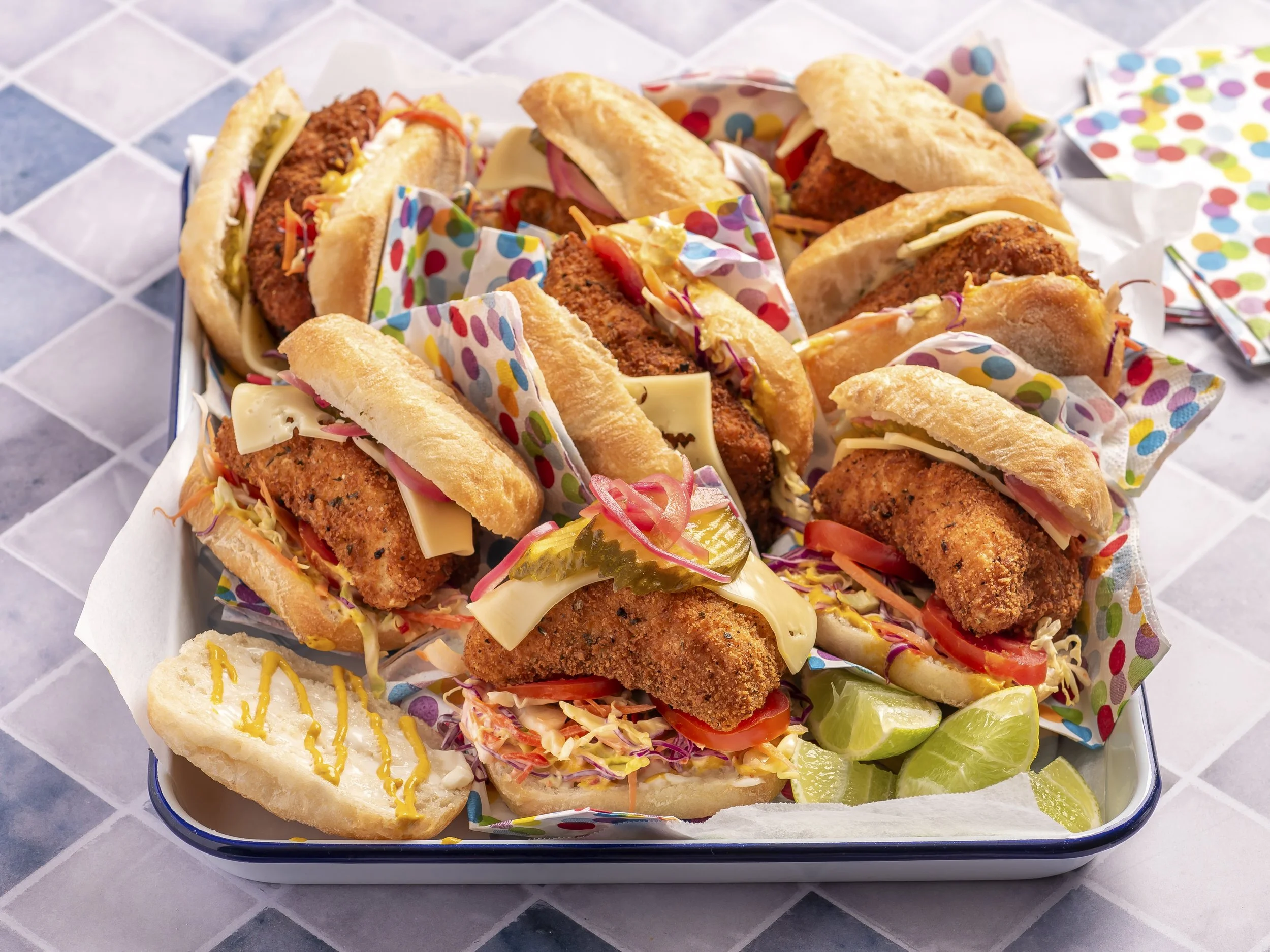 Spread yellow mustard and mayonnaise on the bottom half of each roll.Add ¼ cup coleslaw and a slice or two of tomato, then place crispy crumbed fish on top.Top fish with a slice of Swiss cheese, dill pickles, pickled red onionCover with the top half of the roll and serve.